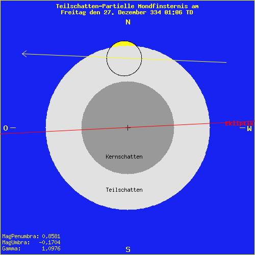 Mondfinsternis am Freitag den 27. Dezember 334 01:06 TD Saros Serie: 59 Mitglied: 59 von 71Inex Serie: 60Lunation: -20594 Abbildung zeigt das Maximum