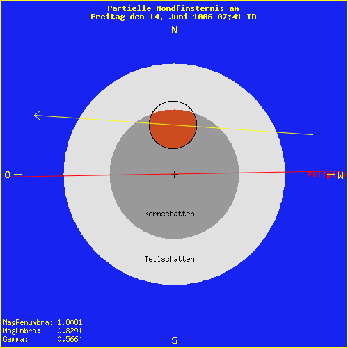 Mondfinsternis am Freitag den 14. Juni 1006 07:41 TD Saros Serie: 104 Mitglied: 30 von 72Inex Serie: 25Lunation: -12289 Abbildung zeigt das Maximum