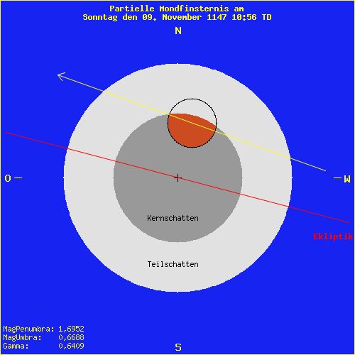 Mondfinsternis am Sonntag den 09. November 1147 10:56 TD Saros Serie: 112 Mitglied: 17 von 72Inex Serie: 20Lunation: -10540 Abbildung zeigt das Maximum