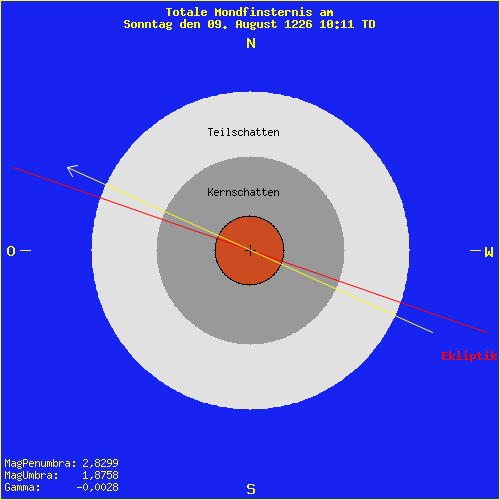 Mondfinsternis am Sonntag den 09. August 1226 10:11 TD Saros Serie: 106 Mitglied: 36 von 73Inex Serie: 34Lunation: -9566 Abbildung zeigt das Maximum