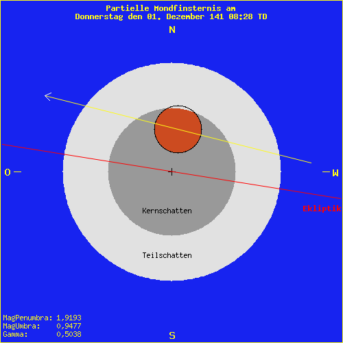 Mondfinsternis am Donnerstag den 01. Dezember 141 08:28 TD Saros Serie: 76 Mitglied: 23 von 73Inex Serie: 22Lunation: -22982 Abbildung zeigt das Maximum