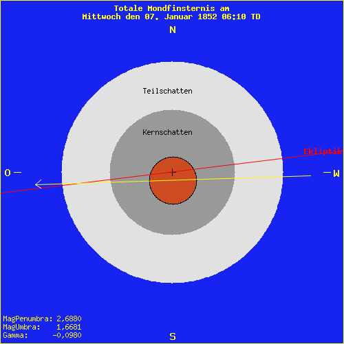 Mondfinsternis am Mittwoch den 07. Januar 1852 06:10 TD Saros Serie: 122 Mitglied: 47 von 74Inex Serie: 43Lunation: -1831 Abbildung zeigt das Maximum