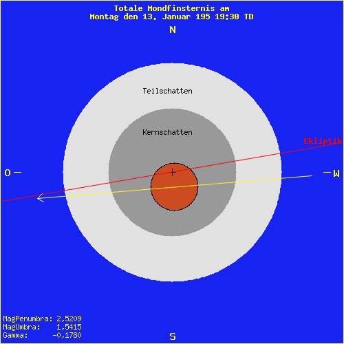 Mondfinsternis am Montag den 13. Januar 195 19:30 TD Saros Serie: 66 Mitglied: 49 von 84Inex Serie: 41Lunation: -22325 Abbildung zeigt das Maximum