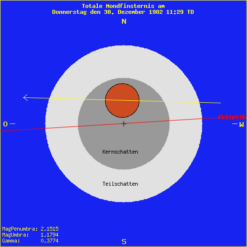 Mondfinsternis am Donnerstag den 30. Dezember 1982 11:29 TD Saros Serie: 134 Mitglied: 25 von 72Inex Serie: 31Lunation: -211 Abbildung zeigt das Maximum