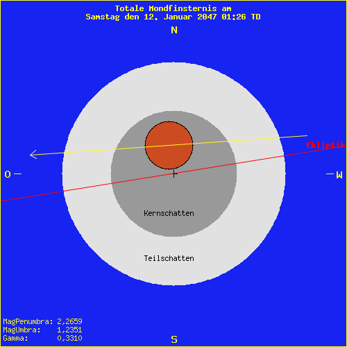 Mondfinsternis am Samstag den 12. Januar 2047 01:26 TD Saros Serie: 125 Mitglied: 50 von 72Inex Serie: 49Lunation: 581 Abbildung zeigt das Maximum