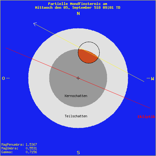 Mondfinsternis am Mittwoch den 05. September 518 09:01 TD Saros Serie: 94 Mitglied: 12 von 71Inex Serie: 14Lunation: -18322 Abbildung zeigt das Maximum