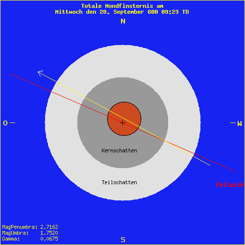 Mondfinsternis am Mittwoch den 28. September 600 09:23 TD Saros Serie: 85 Mitglied: 40 von 76Inex Serie: 33Lunation: -17307 Abbildung zeigt das Maximum