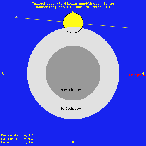 Mondfinsternis am Donnerstag den 19. Juni 783 11:53 TD Inex Serie: 3 Mitglied: 105 von 129Saros Serie: 110Lunation: -15047 Abbildung zeigt das Maximum