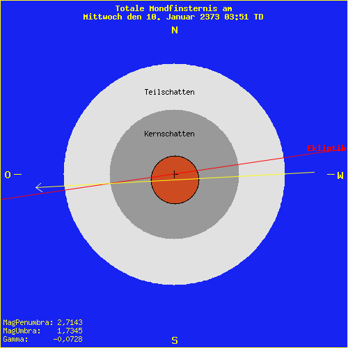 Mondfinsternis am Mittwoch den 10. Januar 2373 03:51 TD Inex Serie: 43 Mitglied: 140 von 183Saros Serie: 140Lunation: 4613 Abbildung zeigt das Maximum
