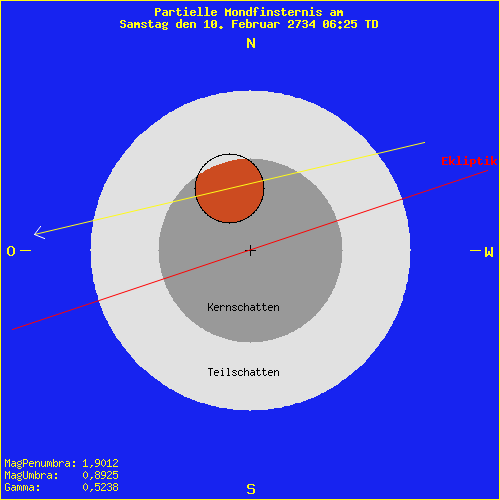 Mondfinsternis am Samstag den 10. Februar 2734 06:25 TD Inex Serie: 55 Mitglied: 145 von 183Saros Serie: 145Lunation: 9079 Abbildung zeigt das Maximum