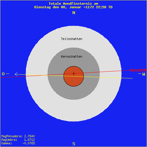 Mondfinsternis am Dienstag den 08. Januar -1172 22:58 TD Inex Serie: 31 Mitglied: 25 von 183Saros Serie: 25Lunation: -39233 Abbildung zeigt das Maximum
