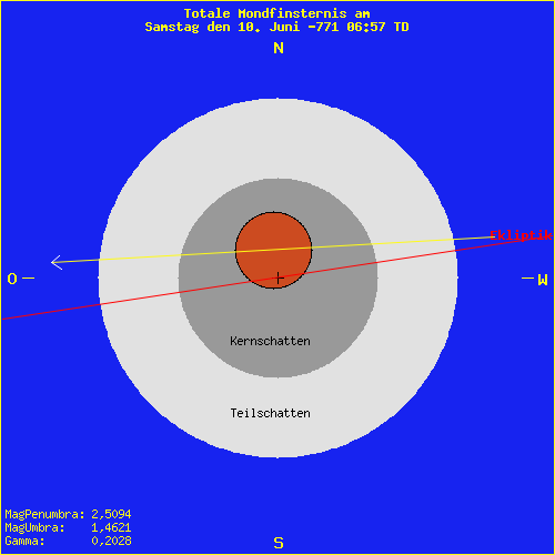 Mondfinsternis am Samstag den 10. Juni -771 06:57 TD Inex Serie: 34 Mitglied: 37 von 183Saros Serie: 37Lunation: -34268 Abbildung zeigt das Maximum