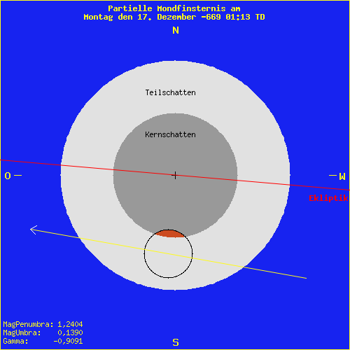 Mondfinsternis am Montag den 17. Dezember -669 01:13 TD Inex Serie: 14 Mitglied: 53 von 183Saros Serie: 53Lunation: -33000 Abbildung zeigt das Maximum