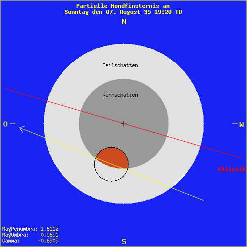 Mondfinsternis am Sonntag den 07. August 35 19:20 TD Inex Serie: 45 Mitglied: 58 von 183Saros Serie: 58Lunation: -24297 Abbildung zeigt das Maximum