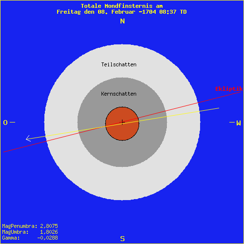 Mondfinsternis am Freitag den 08. Februar -1704 08:37 TD Inex Serie: 32 Mitglied: 6 von 183Saros Serie: 6Lunation: -45812 Abbildung zeigt das Maximum