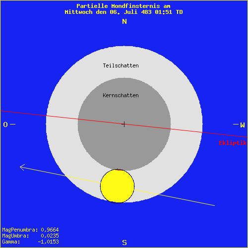 Mondfinsternis am Mittwoch den 06. Juli 483 01:51 TD Inex Serie: 57 Mitglied: 66 von 183Saros Serie: 66Lunation: -18757 Abbildung zeigt das Maximum