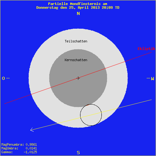 Mondfinsternis am Donnerstag den 25. April 2013 20:09 TD Inex Serie: 68 Mitglied: 70 von 138Saros Serie: 112Lunation: 164 Abbildung zeigt das Maximum