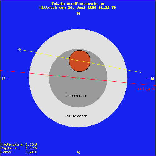 Mondfinsternis am Mittwoch den 28. Juni 1200 12:22 TD Inex Serie: 47 Mitglied: 97 von 183Saros Serie: 97Lunation: -9889 Abbildung zeigt das Maximum