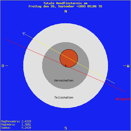 Mondfinsternis am Freitag den 26. September -1093 05:06 TD Saros Serie: 29 Mitglied: 41 von 83Inex Serie: 29Lunation: -38247 Abbildung zeigt das Maximum
