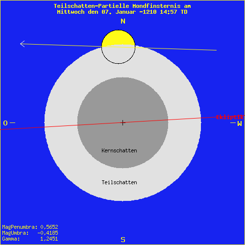 Mondfinsternis am Mittwoch den 07. Januar -1210 14:57 TD Saros Serie: 5 Mitglied: 70 von 77Inex Serie: 61Lunation: -39703 Abbildung zeigt das Maximum