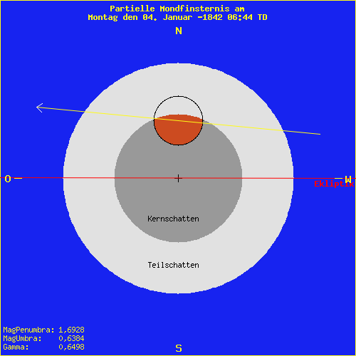 Mondfinsternis am Montag den 04. Januar -1842 06:44 TD Saros Serie: Mitglied: von Inex Serie: Lunation: -47520 Abbildung zeigt das Maximum