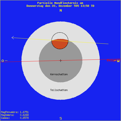 Mondfinsternis am Donnerstag den 22. Dezember 595 13:58 TD Saros Serie: 73 Mitglied: 55 von 72Inex Serie: 52Lunation: -17366 Abbildung zeigt das Maximum