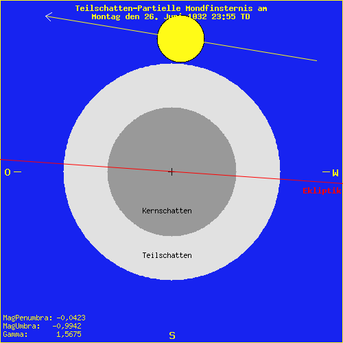 Mondfinsternis am Montag den 26. Juni 1032 23:55 TD Saros Serie: Mitglied: von Inex Serie: Lunation: -11967 Abbildung zeigt das Maximum