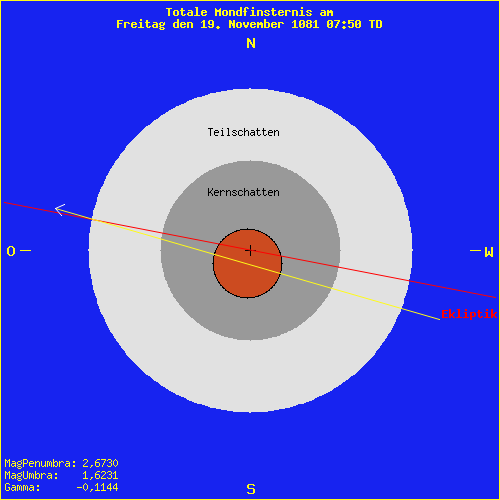 Mondfinsternis am Freitag den 19. November 1081 07:50 TD Saros Serie: 101 Mitglied: 41 von 83Inex Serie: 34Lunation: -11356 Abbildung zeigt das Maximum