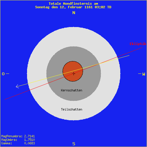 Mondfinsternis am Sonntag den 12. Februar 1161 03:02 TD Saros Serie: 100 Mitglied: 41 von 79Inex Serie: 40Lunation: -10376 Abbildung zeigt das Maximum