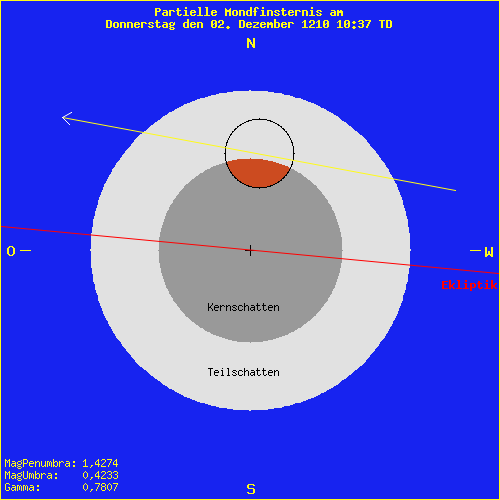 Mondfinsternis am Donnerstag den 02. Dezember 1210 10:37 TD Saros Serie: 93 Mitglied: 52 von 71Inex Serie: 54Lunation: -9760 Abbildung zeigt das Maximum