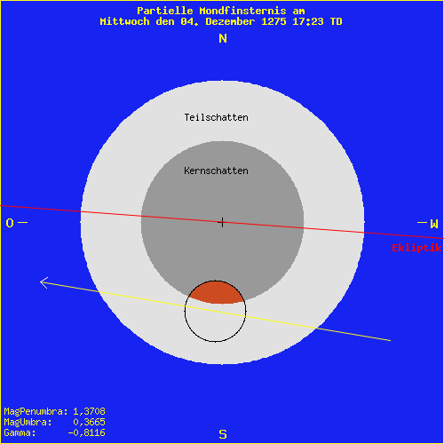 Mondfinsternis am Mittwoch den 04. Dezember 1275 17:23 TD Saros Serie: 94 Mitglied: 54 von 71Inex Serie: 56Lunation: -8956 Abbildung zeigt das Maximum