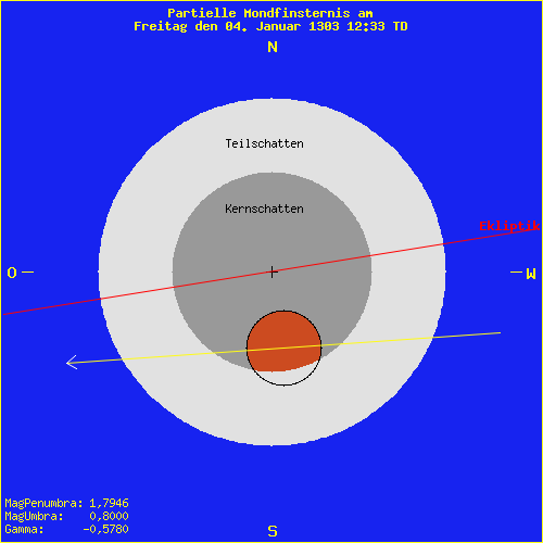 Mondfinsternis am Freitag den 04. Januar 1303 12:33 TD Saros Serie: 113 Mitglied: 24 von 71Inex Serie: 27Lunation: -8621 Abbildung zeigt das Maximum