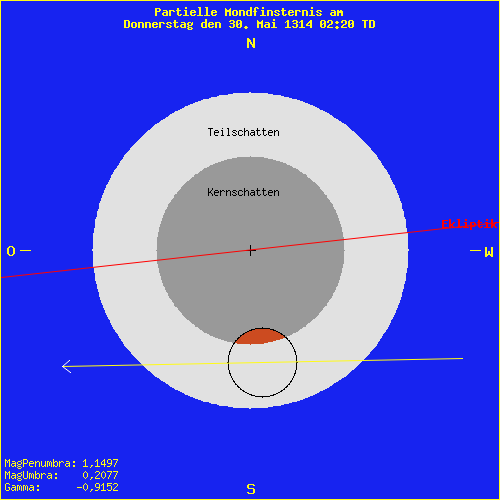 Mondfinsternis am Donnerstag den 30. Mai 1314 02:20 TD Saros Serie: 119 Mitglied: 22 von 82Inex Serie: 18Lunation: -8480 Abbildung zeigt das Maximum
