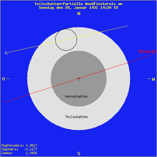 Mondfinsternis am Sonntag den 28. Januar 1431 14:28 TD Saros Serie: 95 Mitglied: 61 von 71Inex Serie: 63Lunation: -7037 Abbildung zeigt das Maximum
