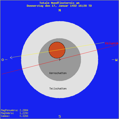 Mondfinsternis am Donnerstag den 17. Januar 1432 16:28 TD Saros Serie: 105 Mitglied: 49 von 73Inex Serie: 47Lunation: -7025 Abbildung zeigt das Maximum
