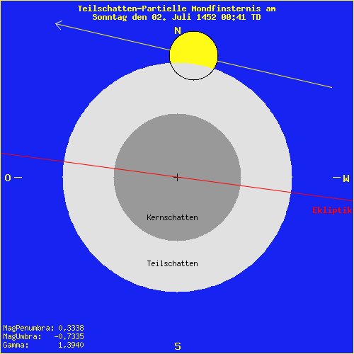 Mondfinsternis am Sonntag den 02. Juli 1452 00:41 TD Saros Serie: 130 Mitglied: 3 von 71Inex Serie: 8Lunation: -6772 Abbildung zeigt das Maximum