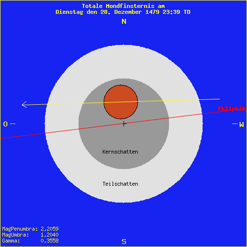 Mondfinsternis am Dienstag den 28. Dezember 1479 23:39 TD Saros Serie: 116 Mitglied: 28 von 73Inex Serie: 32Lunation: -6432 Abbildung zeigt das Maximum