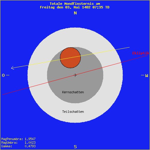 Mondfinsternis am Freitag den 03. Mai 1482 07:35 TD Saros Serie: 103 Mitglied: 57 von 82Inex Serie: 53Lunation: -6403 Abbildung zeigt das Maximum