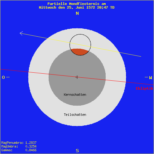 Mondfinsternis am Mittwoch den 25. Juni 1572 20:47 TD Saros Serie: 103 Mitglied: 62 von 82Inex Serie: 58Lunation: -5288 Abbildung zeigt das Maximum