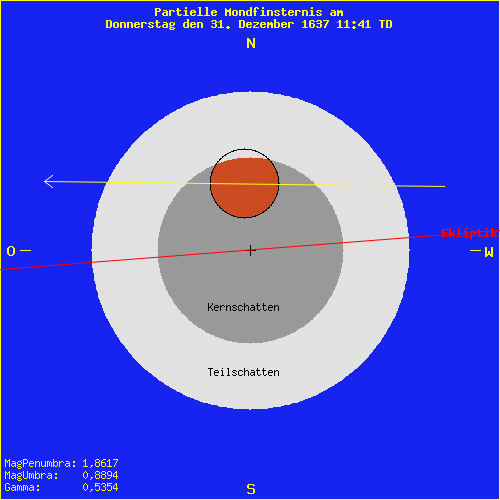Mondfinsternis am Donnerstag den 31. Dezember 1637 11:41 TD Saros Serie: 109 Mitglied: 51 von 71Inex Serie: 52Lunation: -4478 Abbildung zeigt das Maximum