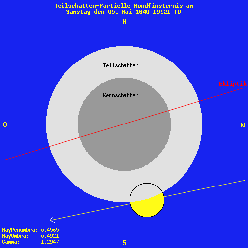 Mondfinsternis am Samstag den 05. Mai 1640 19:21 TD Saros Serie: 96 Mitglied: 68 von 71Inex Serie: 73Lunation: -4449 Abbildung zeigt das Maximum