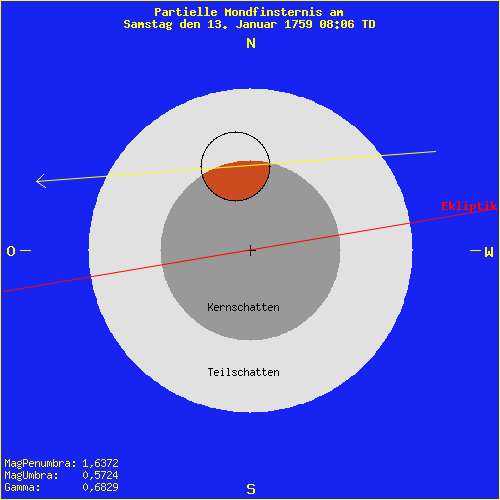 Mondfinsternis am Samstag den 13. Januar 1759 08:06 TD Saros Serie: 130 Mitglied: 20 von 71Inex Serie: 25Lunation: -2981 Abbildung zeigt das Maximum