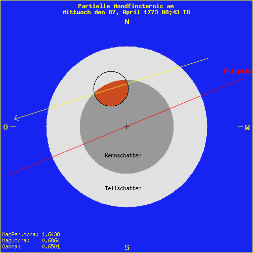 Mondfinsternis am Mittwoch den 07. April 1773 08:43 TD Saros Serie: 128 Mitglied: 27 von 71Inex Serie: 29Lunation: -2805 Abbildung zeigt das Maximum