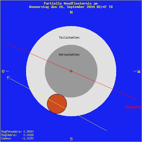 Mondfinsternis am Donnerstag den 28. September 2034 02:47 TD Saros Serie: 147 Mitglied: 9 von 70Inex Serie: 13Lunation: 429 Abbildung zeigt das Maximum