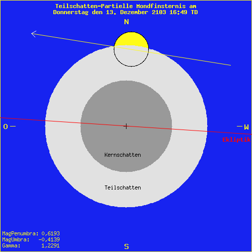 Mondfinsternis am Donnerstag den 13. Dezember 2103 16:49 TD Saros Serie: 117 Mitglied: 57 von 71Inex Serie: 65Lunation: 1285 Abbildung zeigt das Maximum