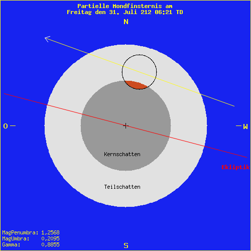 Mondfinsternis am Freitag den 31. Juli 212 06:21 TD Saros Serie: 61 Mitglied: 56 von 78Inex Serie: 50Lunation: -22108 Abbildung zeigt das Maximum