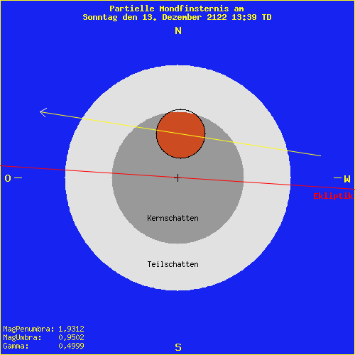 Mondfinsternis am Sonntag den 13. Dezember 2122 13:39 TD Saros Serie: 127 Mitglied: 48 von 72Inex Serie: 50Lunation: 1520 Abbildung zeigt das Maximum