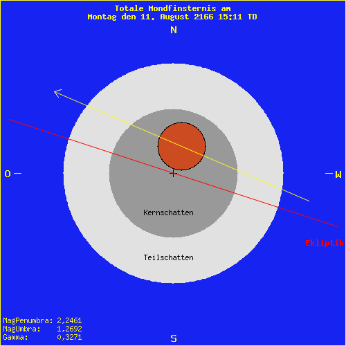 Mondfinsternis am Montag den 11. August 2166 15:11 TD Saros Serie: 131 Mitglied: 42 von 72Inex Serie: 46Lunation: 2060 Abbildung zeigt das Maximum