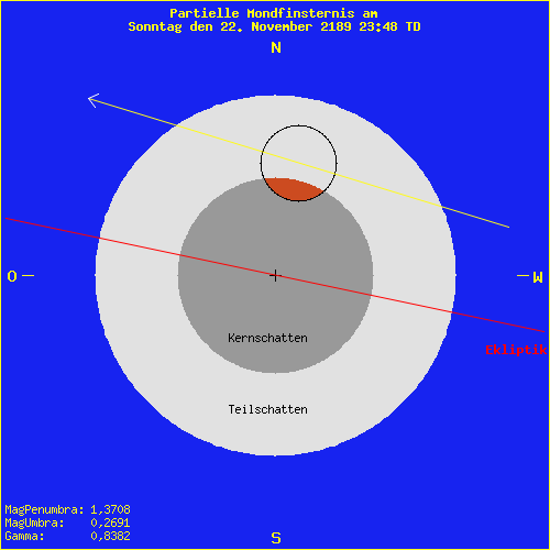 Mondfinsternis am Sonntag den 22. November 2189 23:48 TD Saros Serie: 148 Mitglied: 13 von 70Inex Serie: 20Lunation: 2348 Abbildung zeigt das Maximum