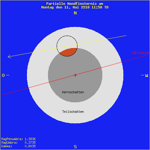Mondfinsternis am Montag den 11. Mai 2218 11:58 TD Saros Serie: 144 Mitglied: 27 von 71Inex Serie: 28Lunation: 2700 Abbildung zeigt das Maximum